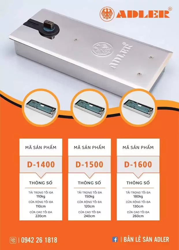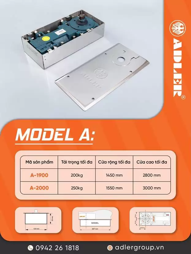 Mỗi model bản lề sàn ADLER lại phù hợp với từng bộ cửa có kích thước và tải trọng khác nhau. Cụ thể:
